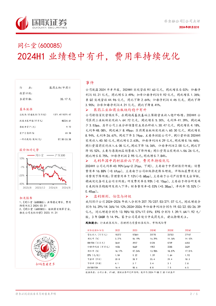 国联证券:同仁堂(600085)-2024H1业绩稳中有升,费用率持续优化.pdf