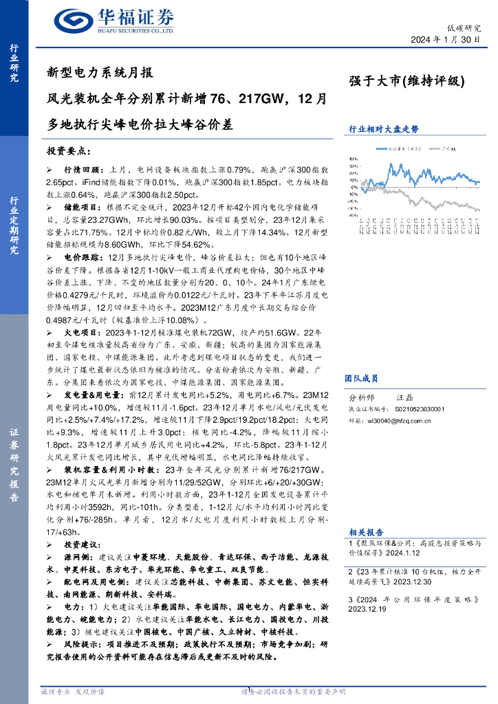 华福证券:新型电力系统月报:风光装机全年分别累计新增76、217GW,12月多地执行尖峰电价拉大峰谷价差.pdf