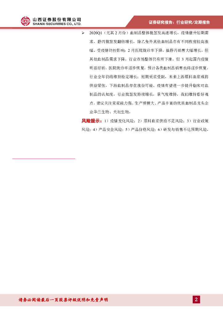 山西证券:医药生物:2020Q1血制品批签发数据跟踪-整体批签发大幅提升,大部分品种实现高增长.pdf