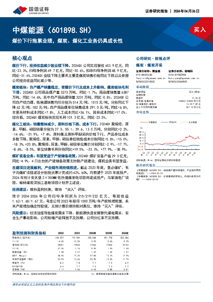 国信证券:中煤能源(601898)-煤价下行拖累业绩,煤炭、煤化工业务仍具成长性.pdf