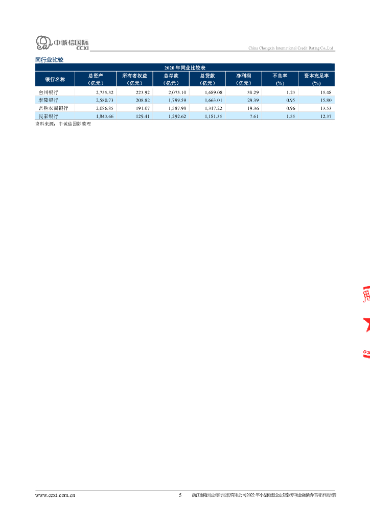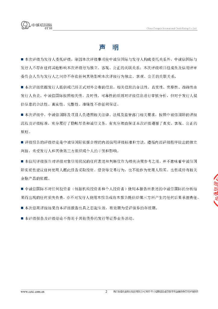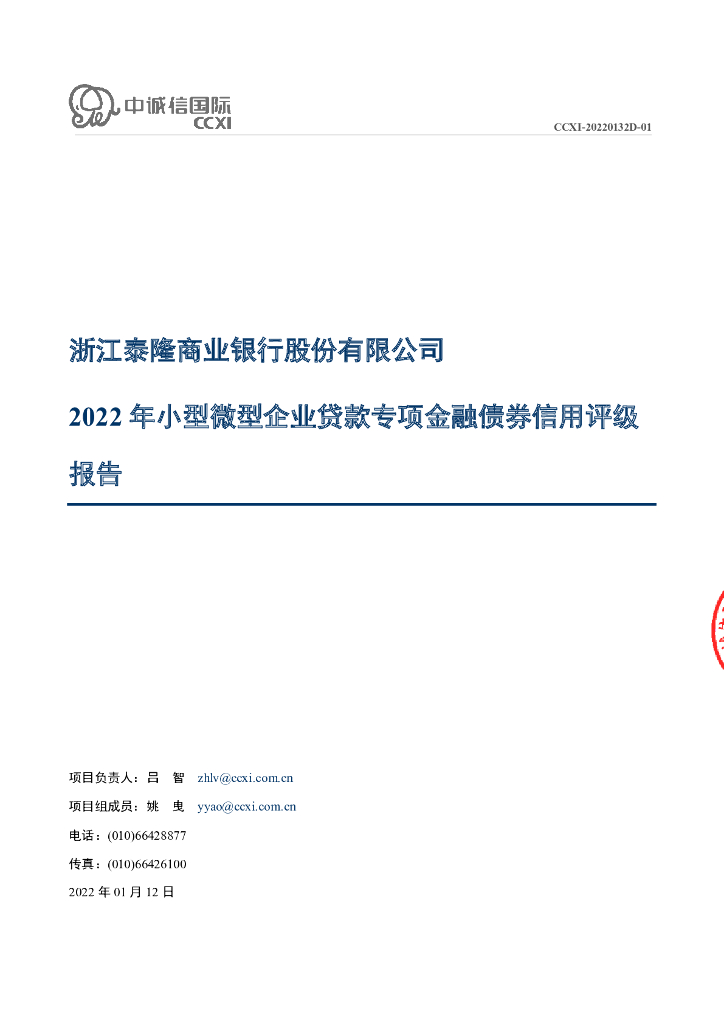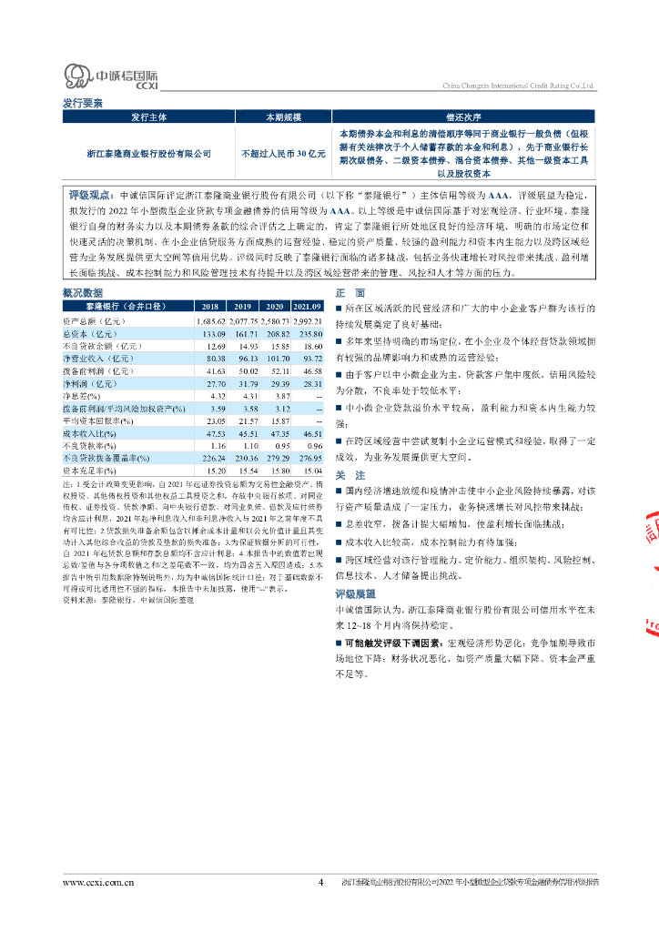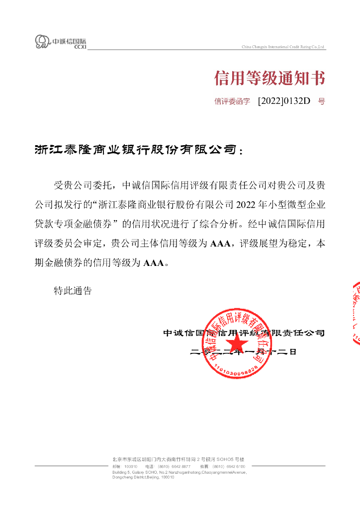 中诚信:浙江泰隆商业银行股份有限公司2022年小型微型企业贷款专项金融债券信用评级报告.pdf