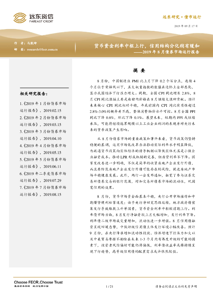 远东资信: 2019年8月份债券市场运行报告:货币资金利率中枢上行,信用结构分化稍有缓和.pdf