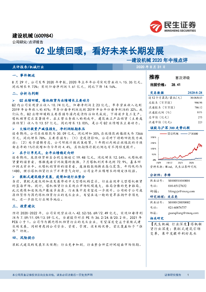 民生证券:建设机械(600984)-2020年中报点评:Q2业绩回暖,看好未来长期发展.pdf