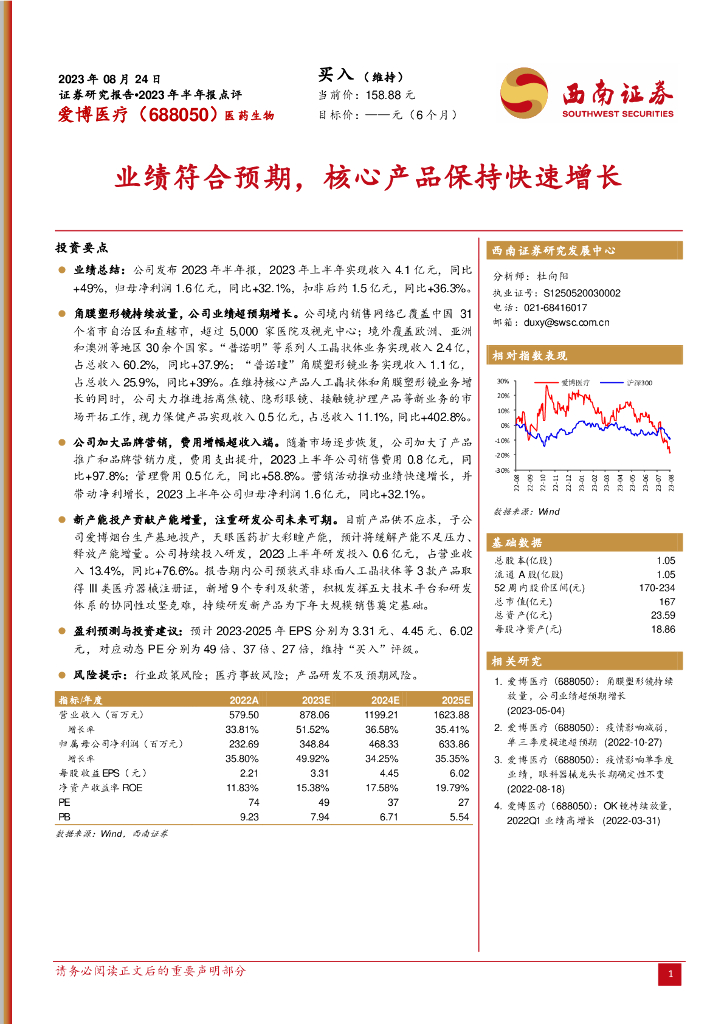 西南证券:爱博医疗(688050)-业绩符合预期,核心产品保持快速增长.pdf