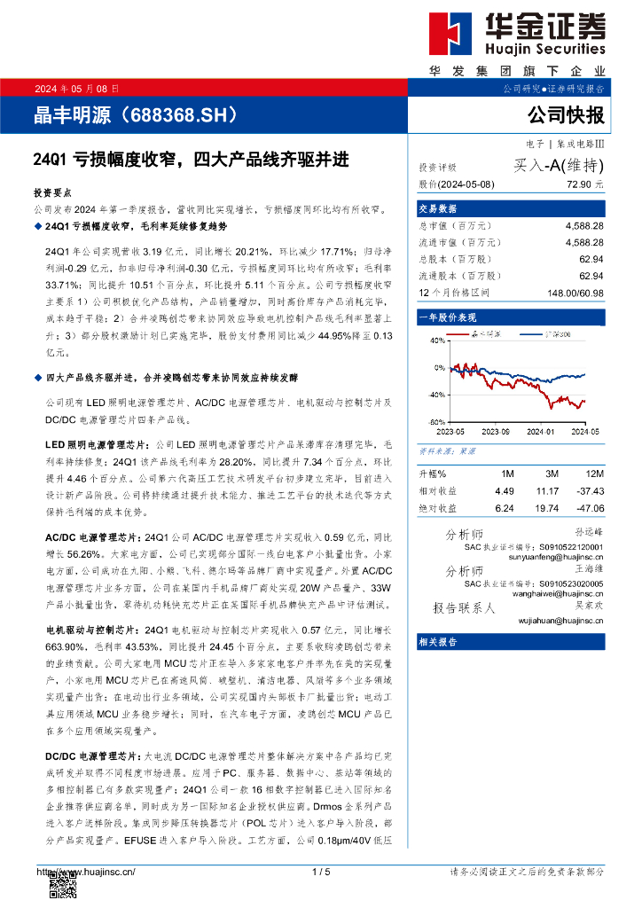 华金证券:晶丰明源(688368)-24Q1亏损幅度收窄,四大产品线齐驱并进.pdf