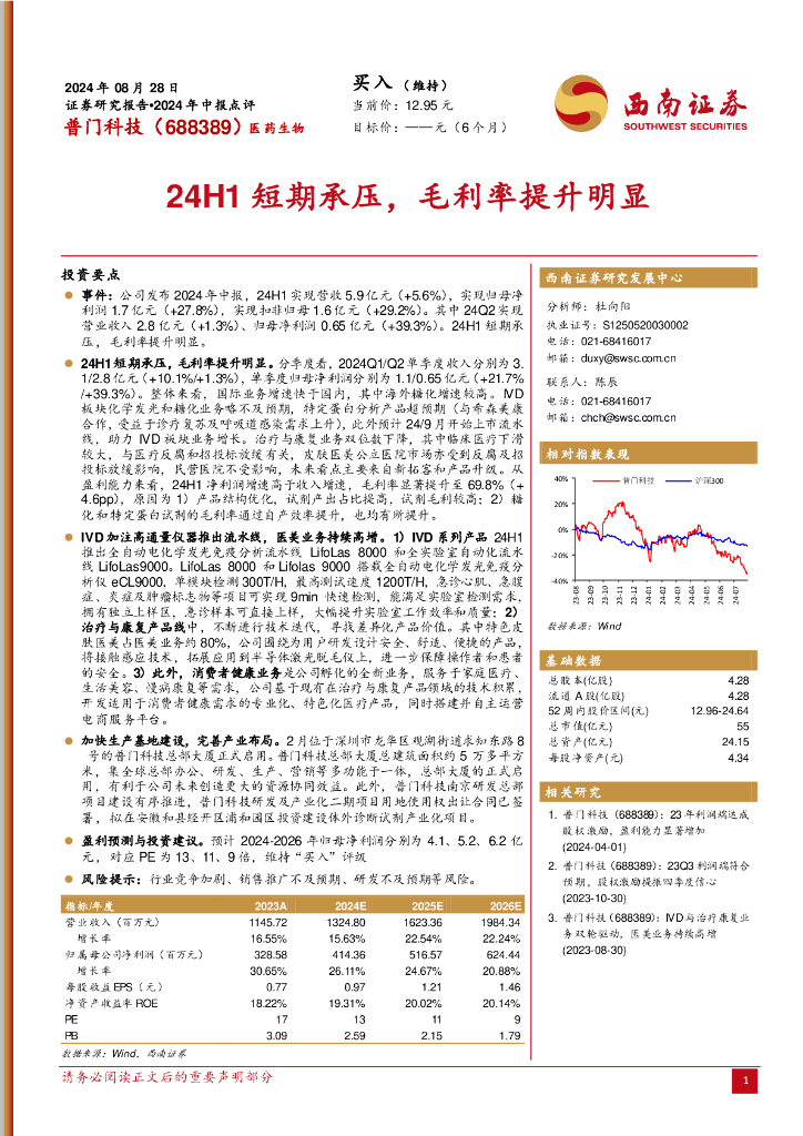 西南证券:普门科技(688389)-2024年中报点评:24H1短期承压,毛利率提升明显.pdf