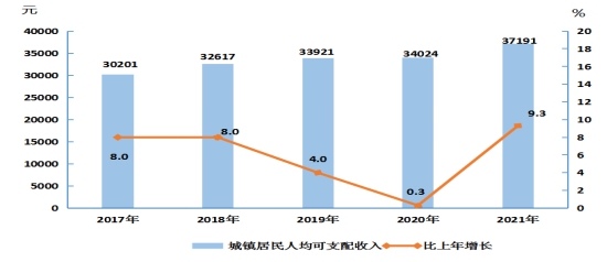 图12 2017-2021年城镇居民人均可支配收入及其增长速度