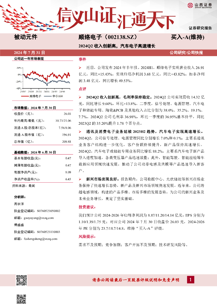 山西证券:顺络电子(002138)-2024Q2收入创新高,汽车电子高速增长.pdf