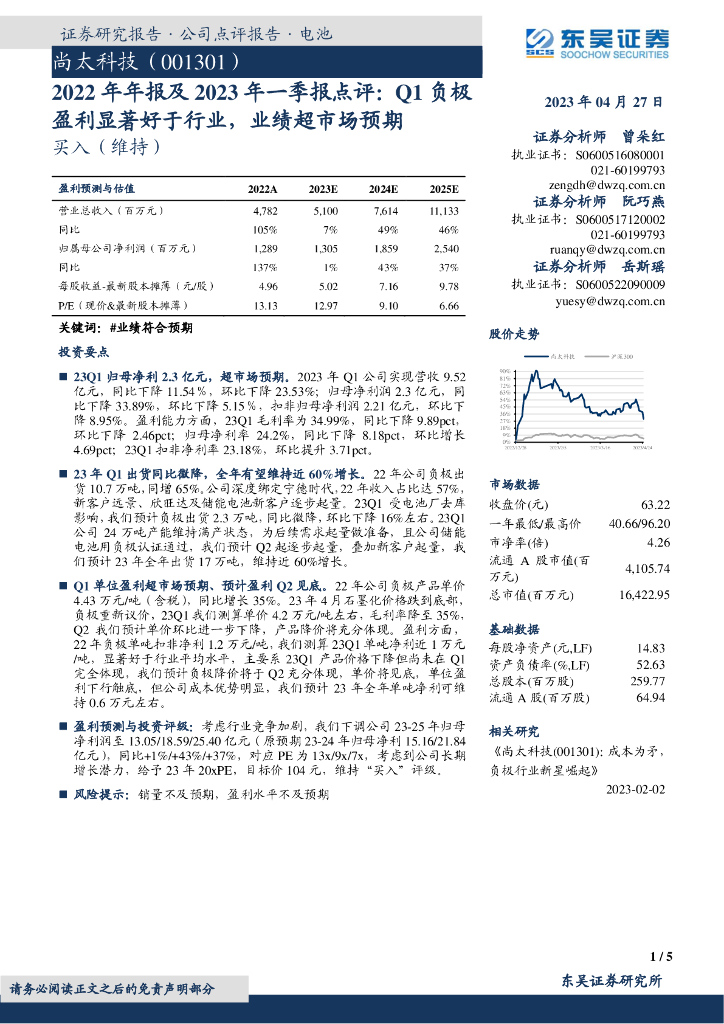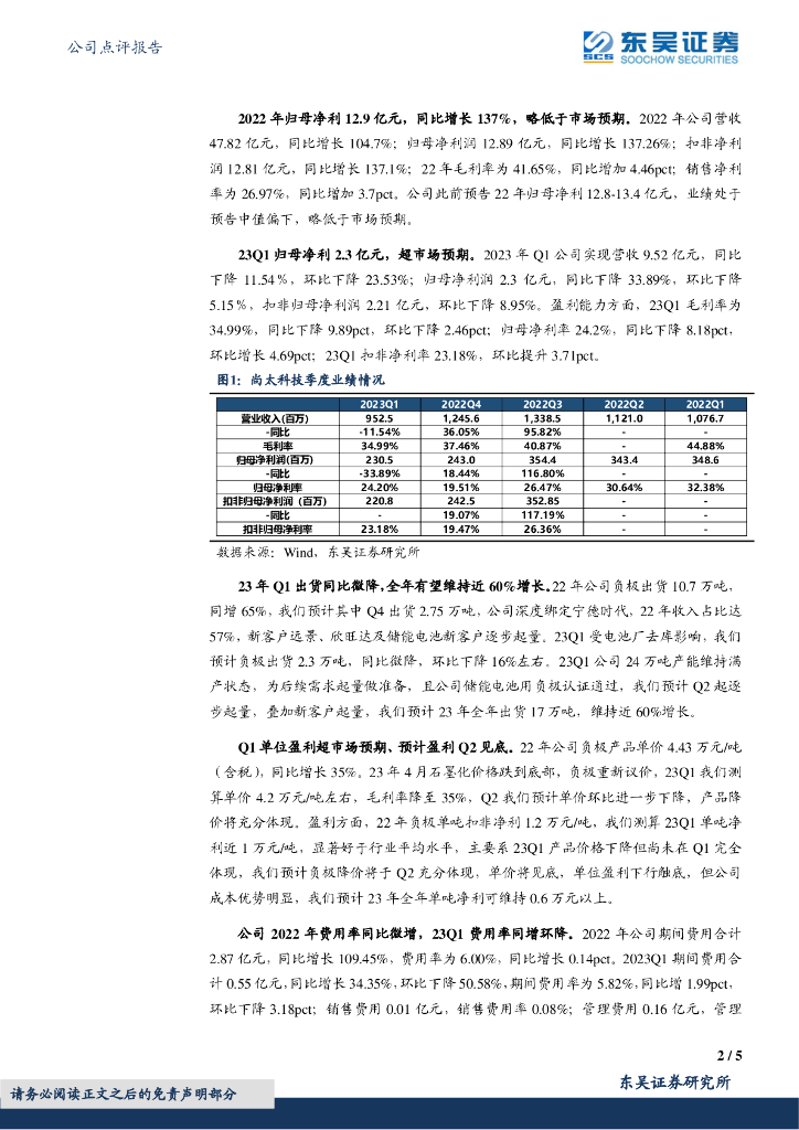 东吴证券:尚太科技(001301)-2022年年报及2023年一季报点评:Q1负极盈利显著好于行业,业绩超市场预期.pdf