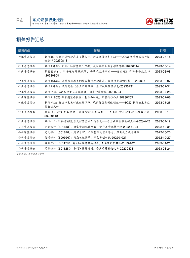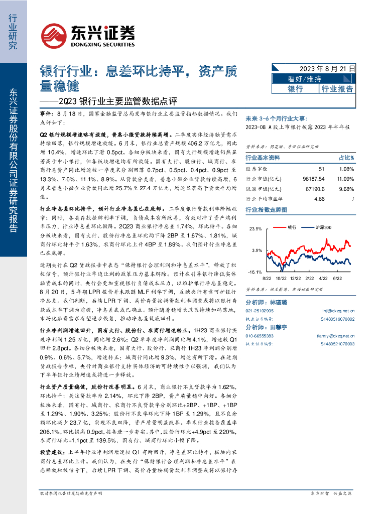 东兴证券:银行行业:息差环比持平,资产质量稳健——2Q23银行业主要监管数据点评.pdf