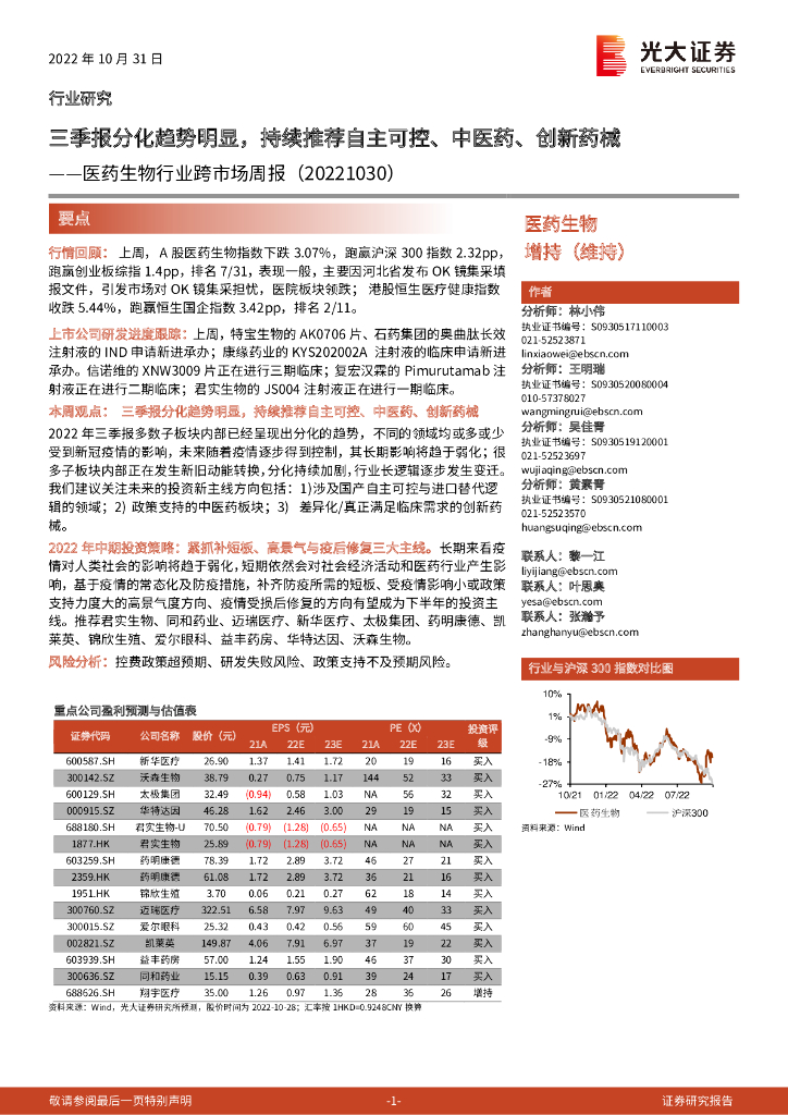 光大证券:医药生物行业跨市场周报:三季报分化趋势明显,持续推荐自主可控、中医药、创新药械.pdf
