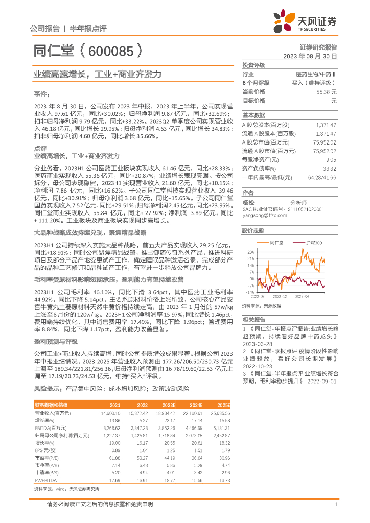天风证券:同仁堂(600085)-业绩高速增长,工业+商业齐发力.pdf