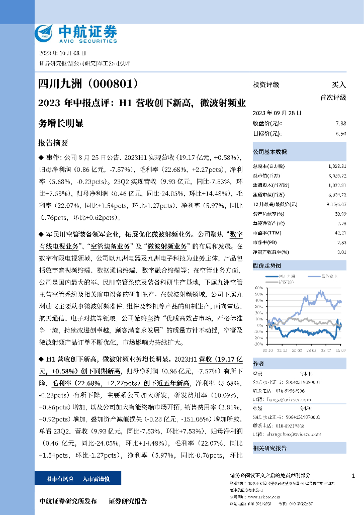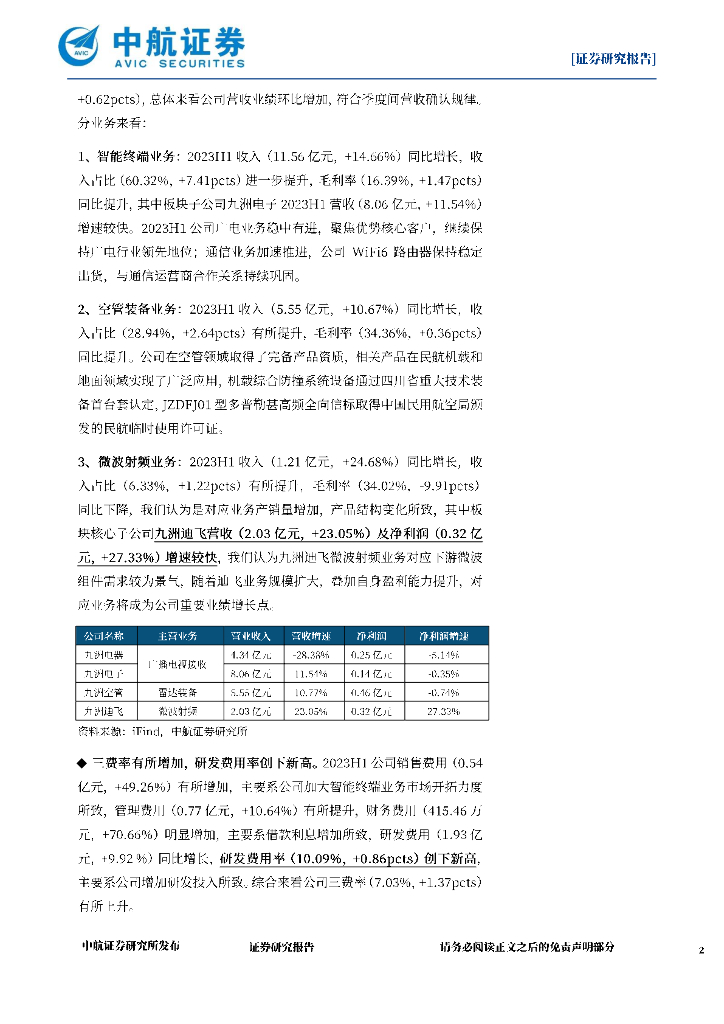 中航证券:四川九洲(000801)-2023年中报点评:H1营收创下新高,微波射频业务增长明显.pdf