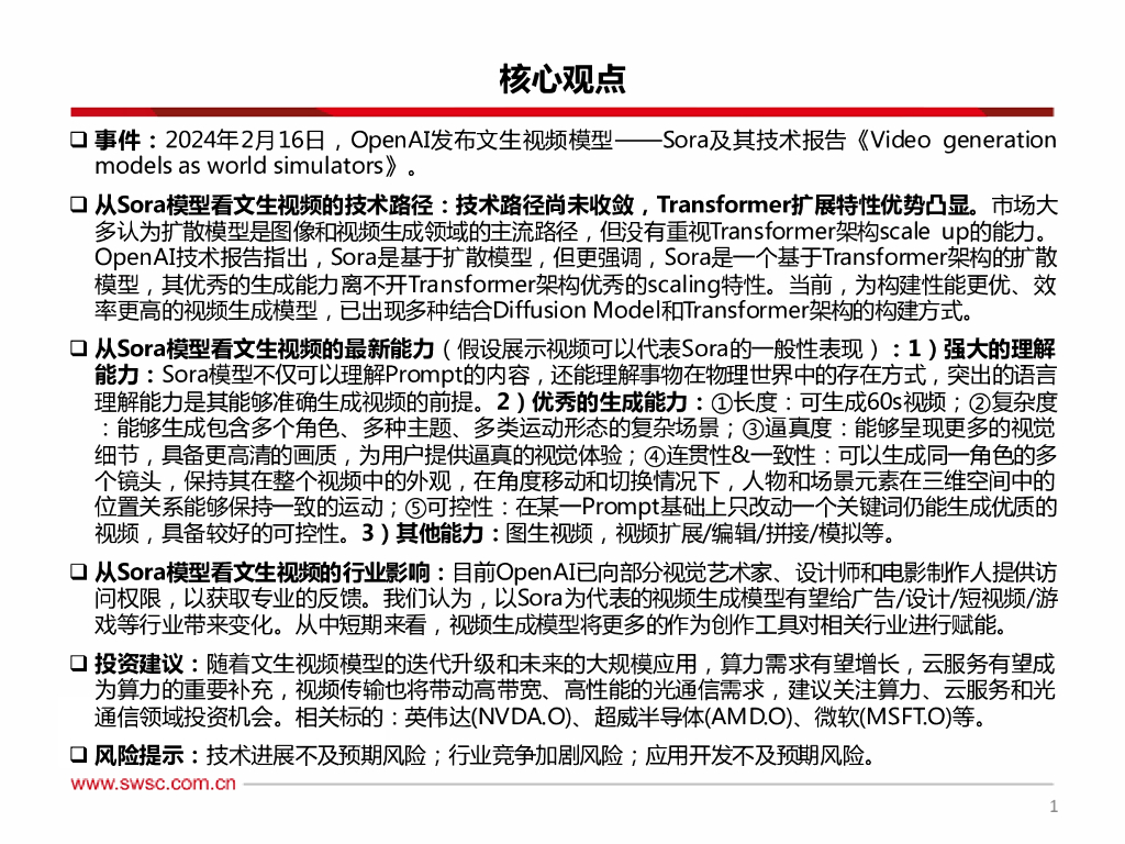 西南证券:OpenAI Sora专题:Transformer扩展优势凸显,视频理解与生成能力提升.pdf