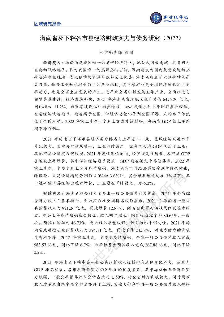 新世纪评级:海南省及下辖各市县经济财政实力与债务研究(2022).pdf