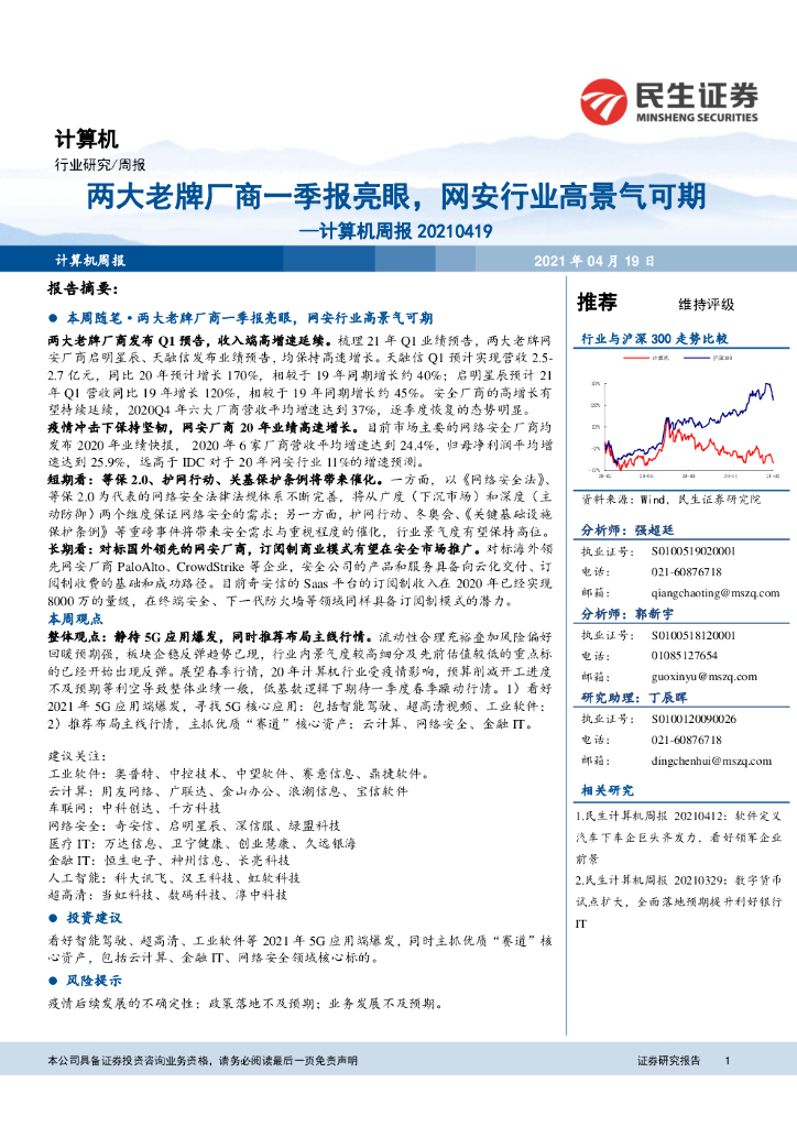 民生证券:计算机周报:两大老牌厂商一季报亮眼,网安行业高景气可期.pdf