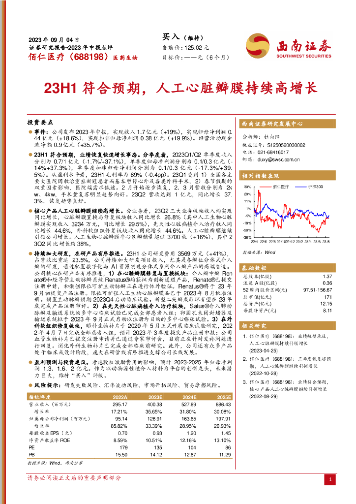 西南证券:佰仁医疗(688198)-23H1符合预期,人工心脏瓣膜持续高增长.pdf