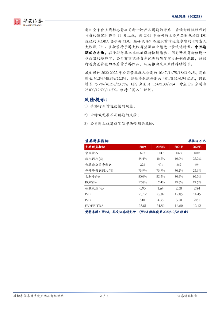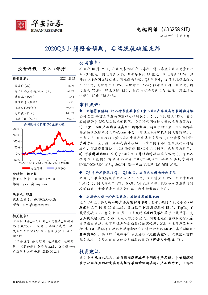华安证券:电魂网络(603258)-2020Q3业绩符合预期,后续发展动能充沛.pdf