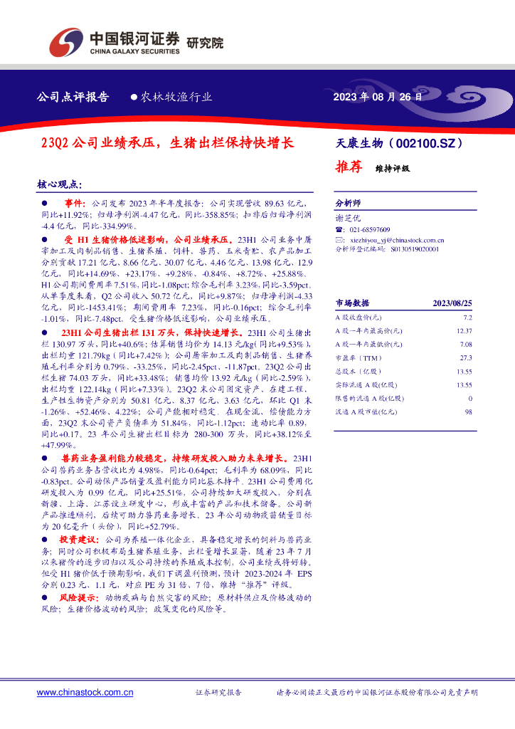 中国银河:天康生物(002100)-23Q2公司业绩承压,生猪出栏保持快增长.pdf