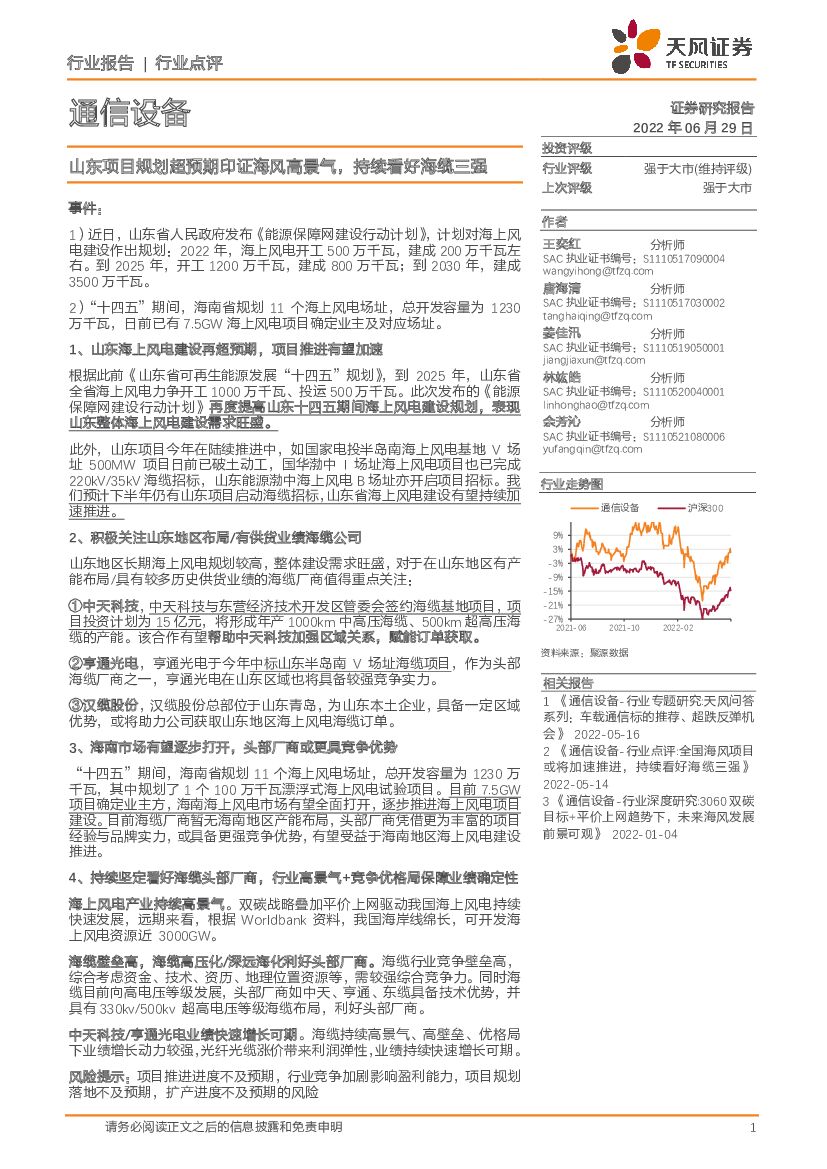 天风证券:通信设备行业点评:山东项目规划超预期印证海风高景气,持续看好海缆三强.pdf