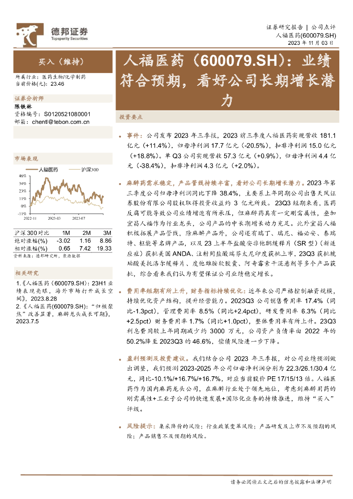 德邦证券:人福医药(600079)-业绩符合预期,看好公司长期增长潜力.pdf