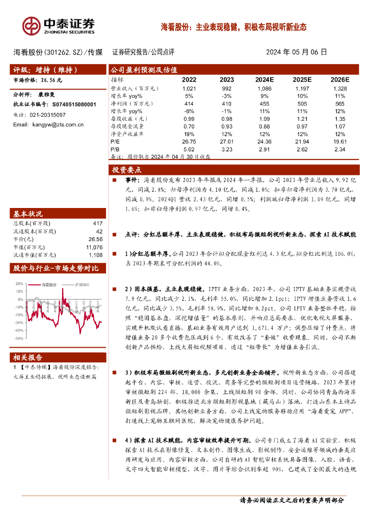 中泰证券:海看股份:主业表现稳健,积极布局视听新业态.pdf
