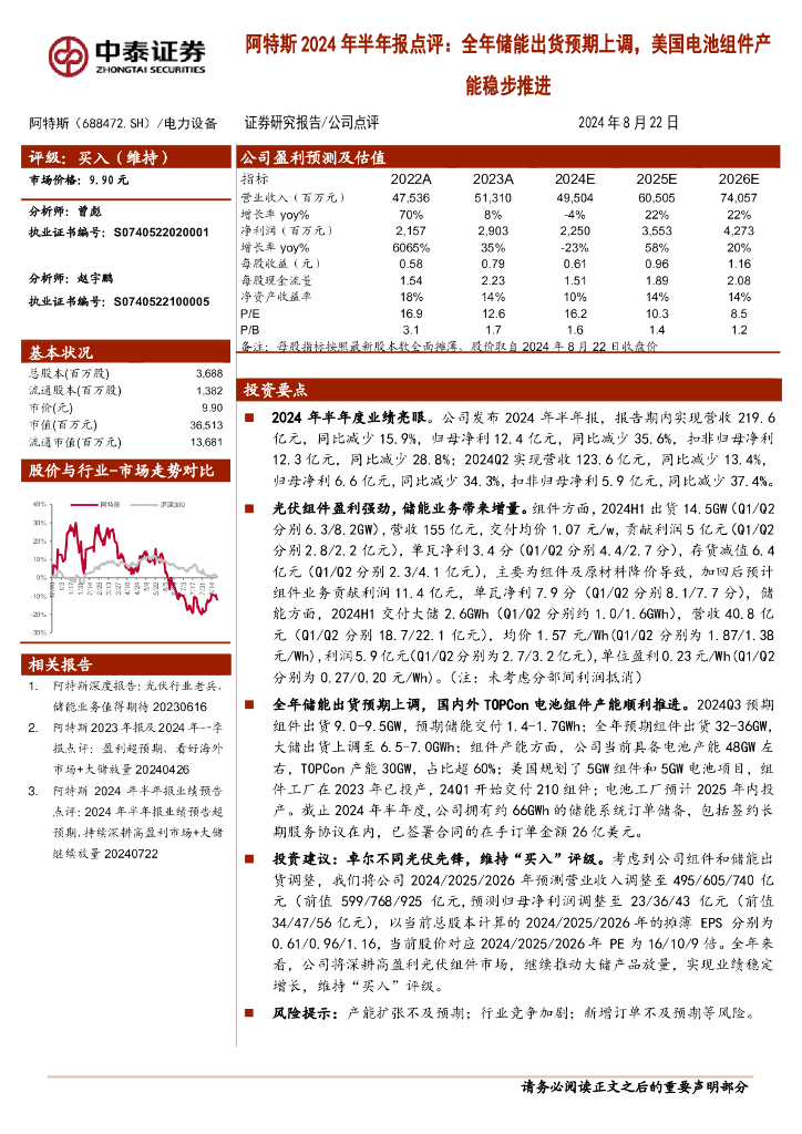 中泰证券:阿特斯2024年半年报点评:全年储能出货预期上调,美国电池组件产能稳步推进.pdf