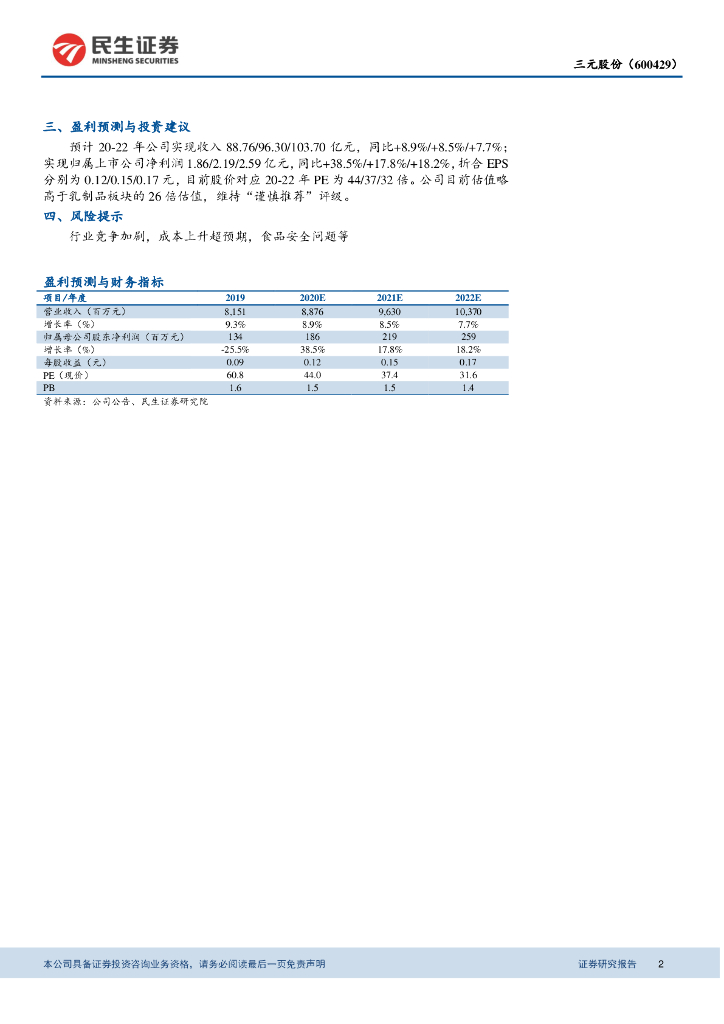 民生证券:三元股份(600429)-2019年报点评:营收保持中速增长,毛销差收窄拖累利润表现.pdf