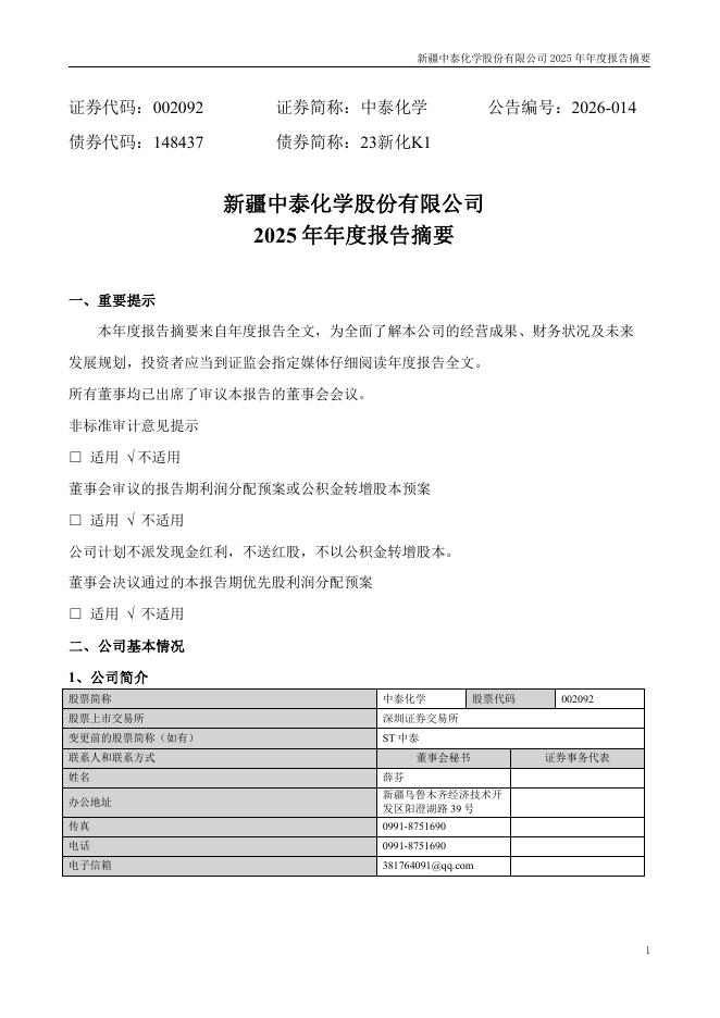 002092-中泰化学:2025年年度报告摘要.pdf