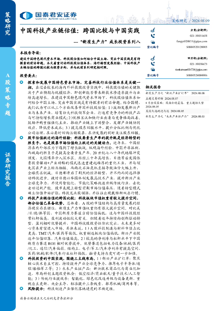 国泰君安:“新质生产力”成长投资系列八:中国科技产业链估值:跨国比较与中国实践.pdf