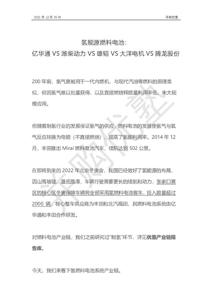 并购优塾:氢能源燃料电池:亿华通VS潍柴动力VS雄韬VS大洋电机VS腾龙股份.pdf
