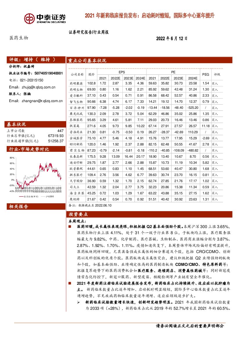 中泰证券:医药生物行业周报:2021年新药临床报告发布:启动耗时缩短,国际多中心逐年提升.pdf