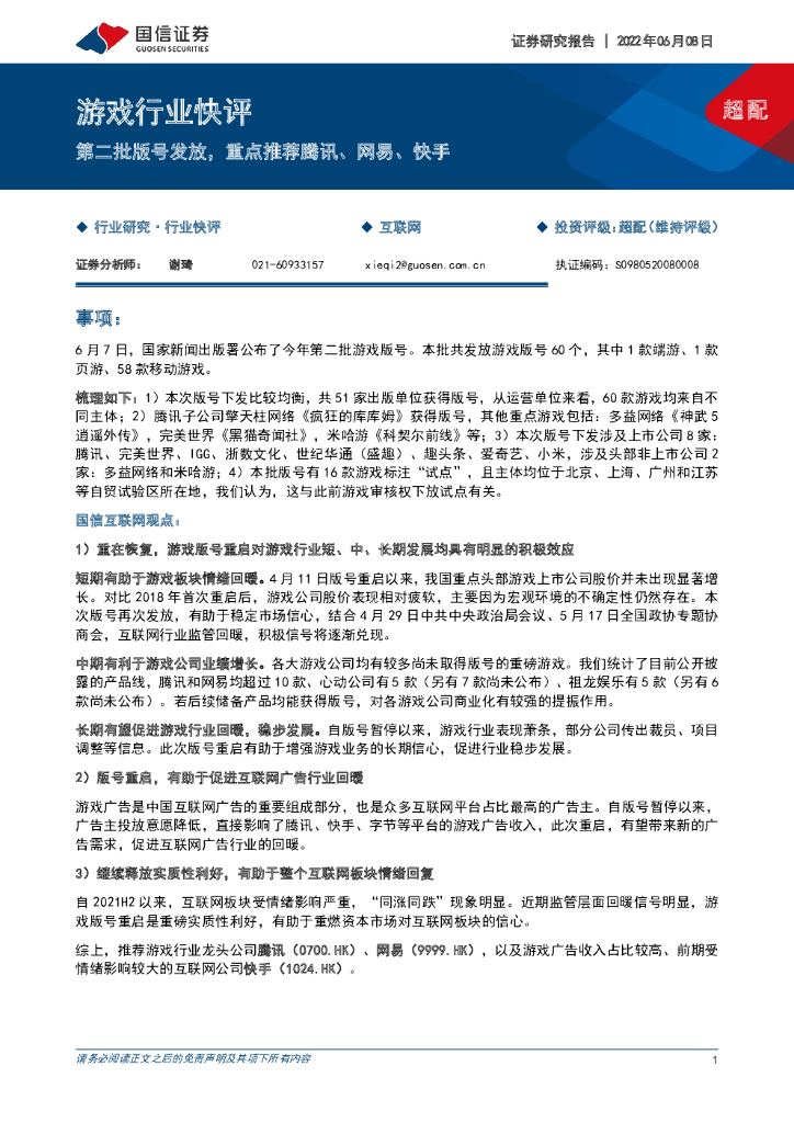 国信证券:游戏行业快评:第二批版号发放,重点推荐腾讯、网易、快手.pdf