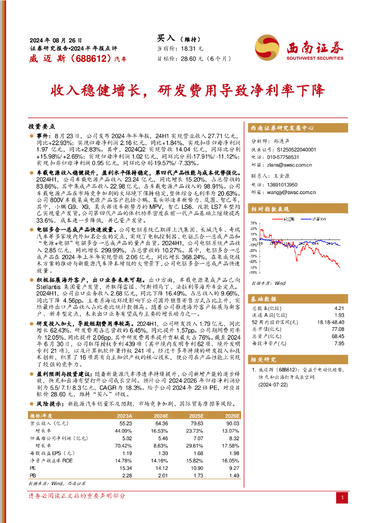西南证券:威迈斯(688612)-2024半年报点评:收入稳健增长,研发费用导致净利率下降.pdf