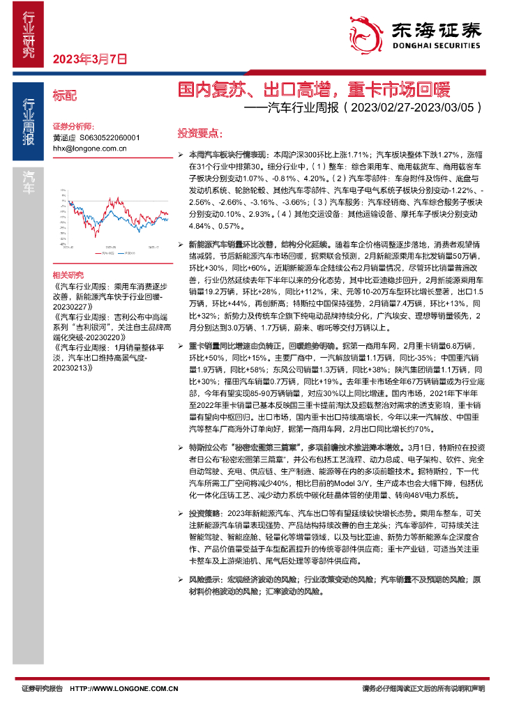 东海证券:汽车行业周报:国内复苏、出口高增,重卡市场回暖.pdf