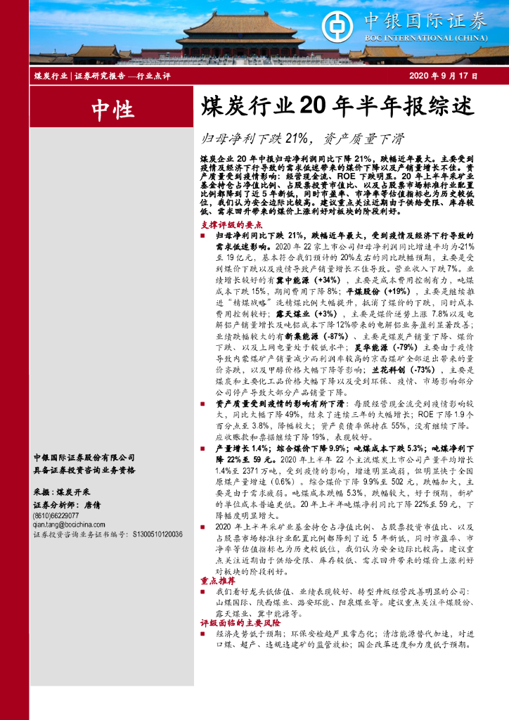 中银证券:煤炭行业20年半年报综述:归母净利下跌21%,资产质量下滑.pdf