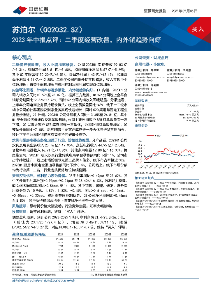 国信证券:苏泊尔(002032)-2023年中报点评:二季度经营改善,内外销趋势向好.pdf