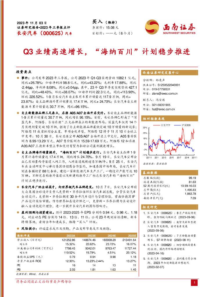 西南证券:长安汽车(000625)-2023年三季报点评:Q3业绩高速增长,“海纳百川”计划稳步推进.pdf