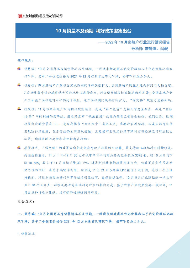 东方金诚: 2022年10月房地产月报-10月销量不及预期 利好政策密集出台.pdf