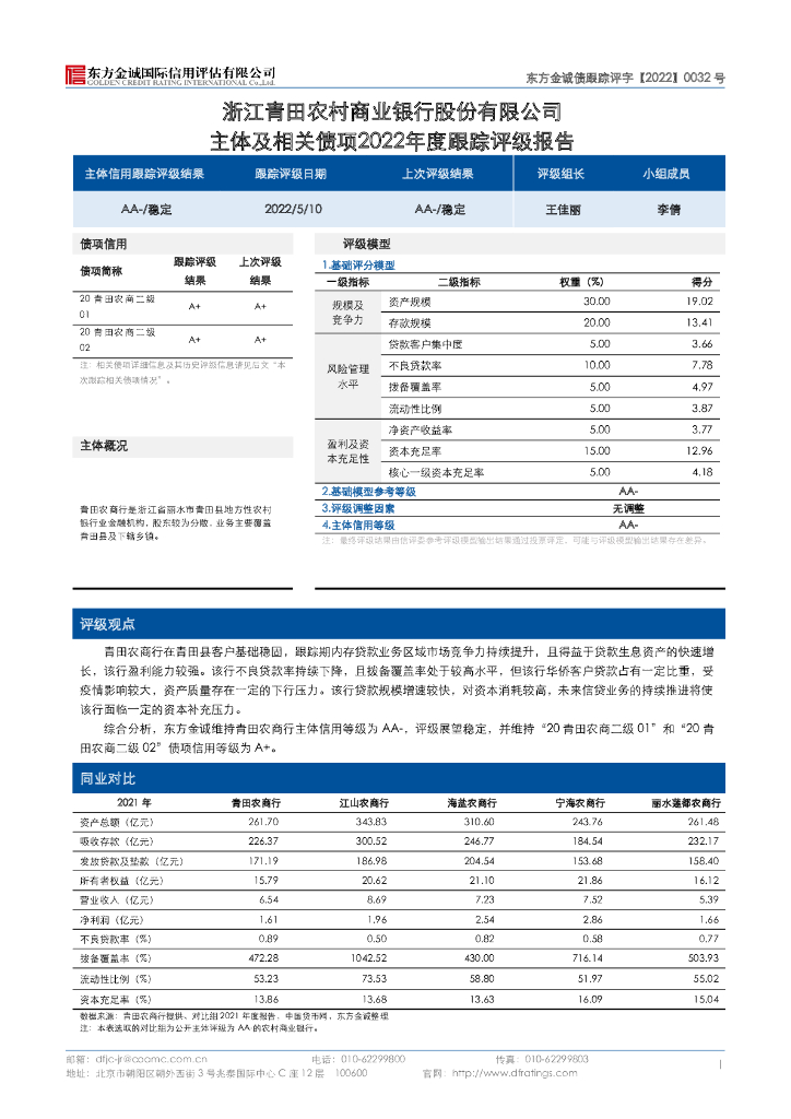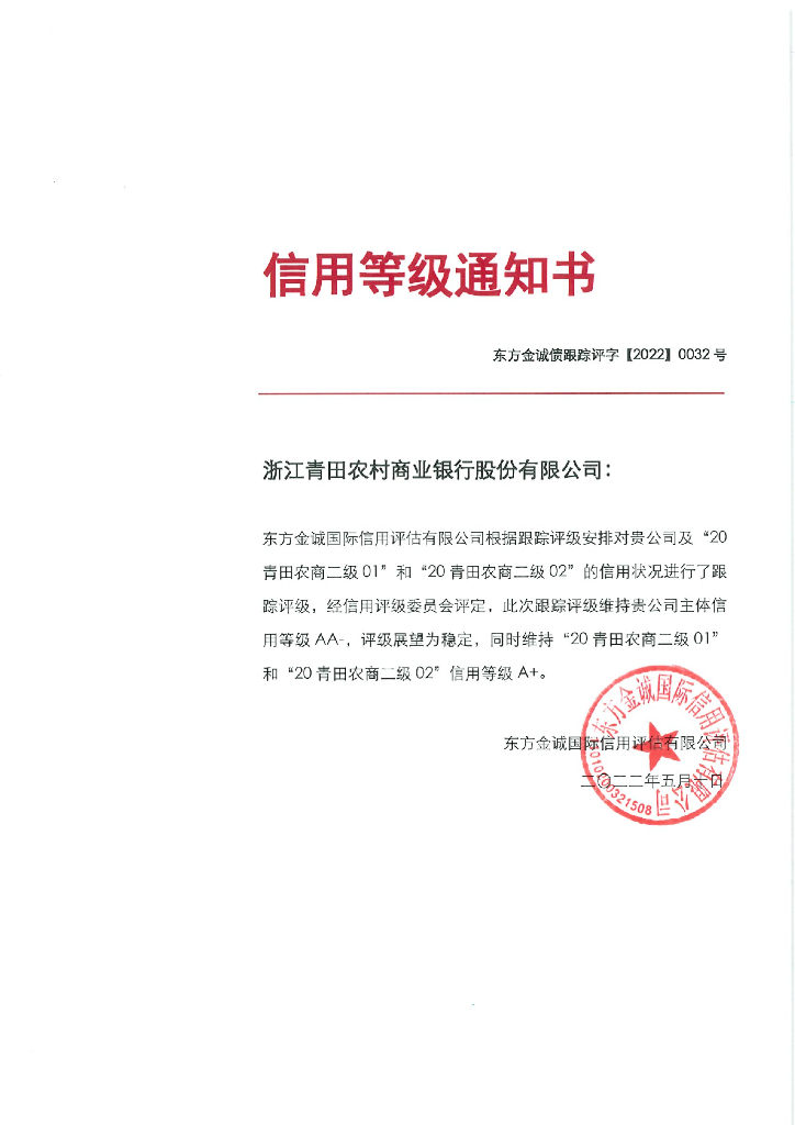 东方金诚:浙江青田农村商业银行股份有限公司主体及相关债项2022年度跟踪评级报告.pdf