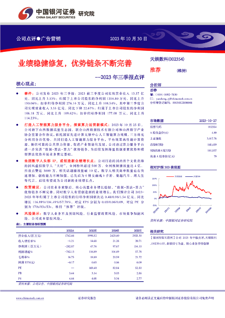 中国银河:【银河传媒互联网】公司2023年三季报点评_天娱数科_(002354.SZ)_业绩稳健修复,优势链条不断完善.pdf