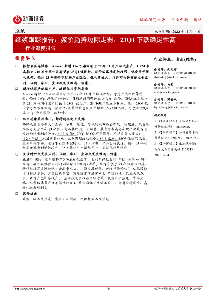 浙商证券:造纸行业深度报告:纸浆跟踪报告:浆价趋势边际走弱,23Q1下跌确定性高.pdf