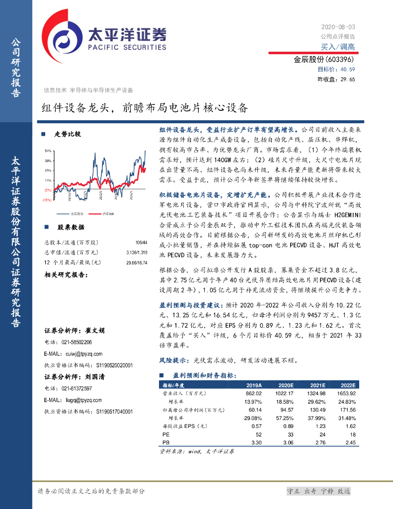 太平洋证券:金辰股份(603396)-组件设备龙头,前瞻布局电池片核心设备.pdf