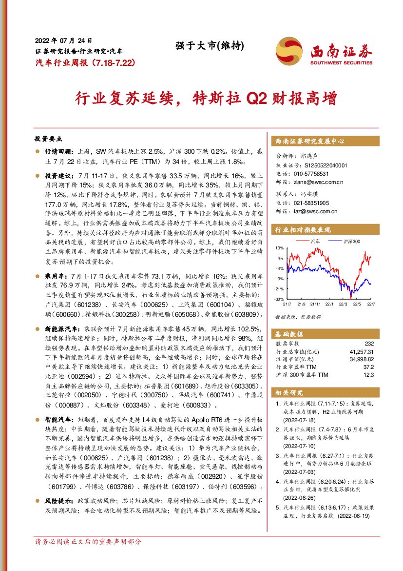 西南证券:汽车行业周报:行业复苏延续,特斯拉Q2财报高增.pdf