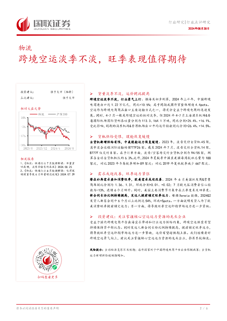 国联证券:物流:跨境空运淡季不淡,旺季表现值得期待.pdf