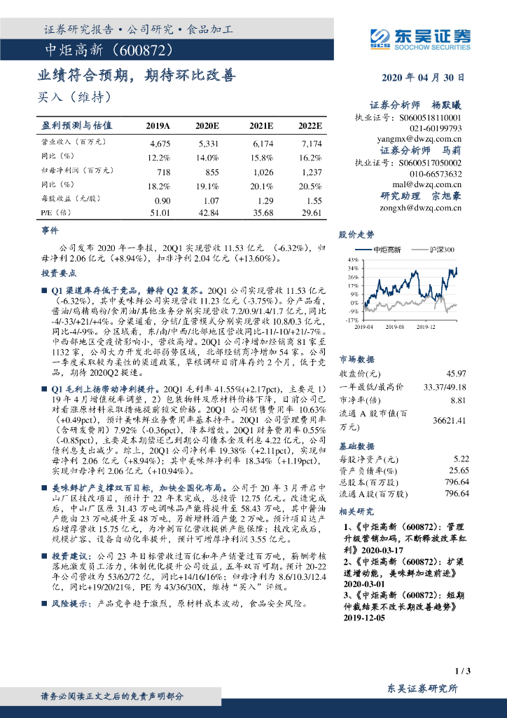 东吴证券:中炬高新(600872)-业绩符合预期,期待环比改善.pdf