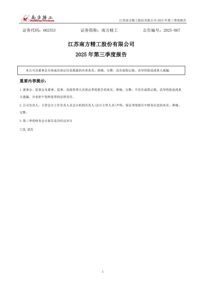 002553-南方精工:2025年三季度报告.pdf