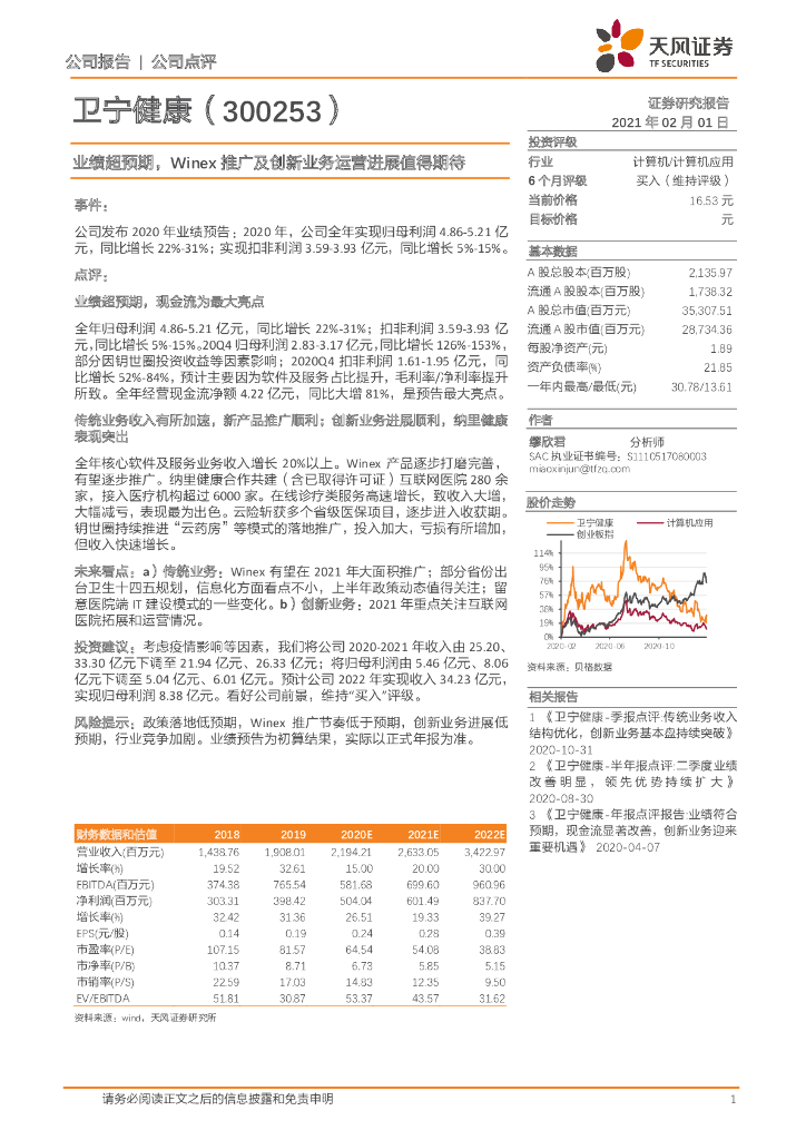 天风证券:卫宁健康(300253)-业绩超预期,Winex推广及创新业务运营进展值得期待.pdf