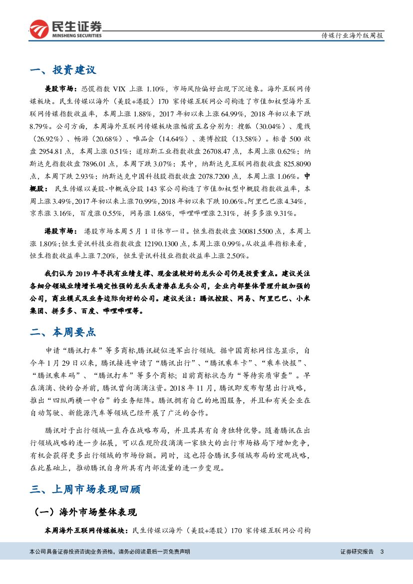 民生证券:传媒互联网行业-海外周报:申请“腾讯打车”等多商标,腾讯战略布局出行领域.pdf
