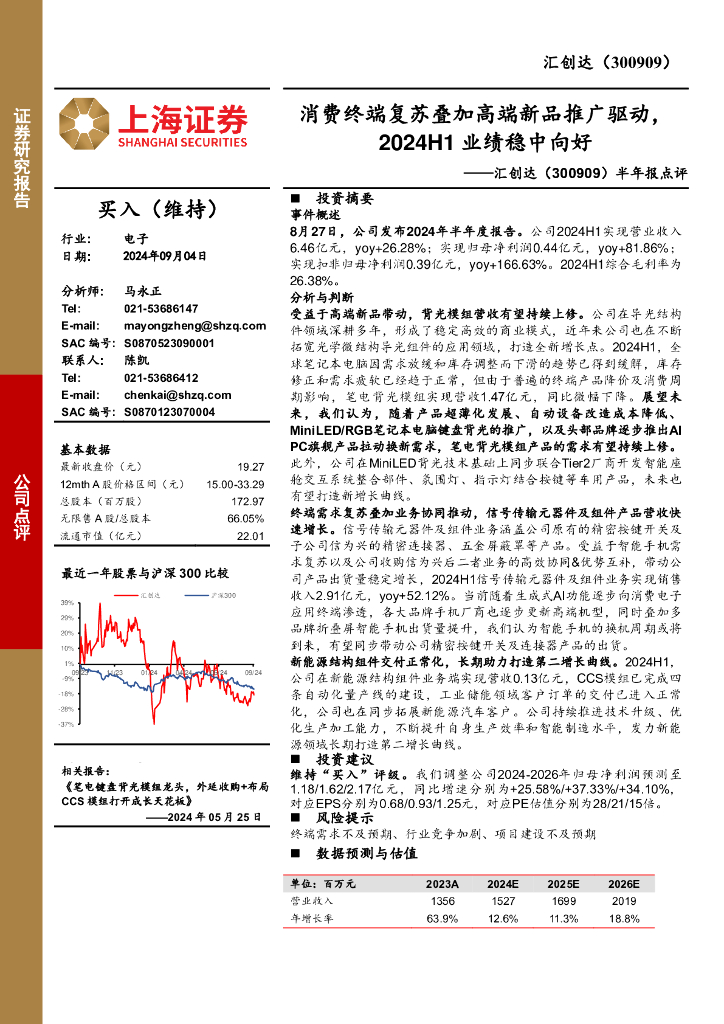 上海证券:汇创达(300909)-半年报点评:消费终端复苏叠加高端新品推广驱动,2024H1业绩稳中向好.pdf